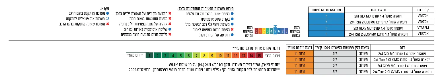 הויטארה הבטיחותית ביותר אי פעם, בעלת תקן האירופי המחמיר GSR הבטיחות כאן היא ללא פשרות ואיתו מגיע חבילת בטיחות מקיפה הכוללת 7 כריות אוויר, מערכת בקרת יציבות ESP מתקדמת, מערכת ניטור לחץ אוויר בצמיגים ובקרת זינוק בעלייה. המרכב בעל הקשיחות הגבוהה והמשקל המאוזן מעניקים לכם שקט נפשי בכל נסיעה.