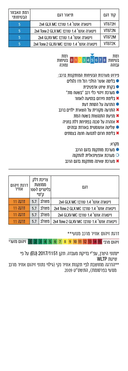 הויטארה הבטיחותית ביותר אי פעם, בעלת תקן האירופי המחמיר GSR הבטיחות כאן היא ללא פשרות שמגיע חבילת בטיחות מקיפה הכוללת 7 כריות אוויר, מערכת בקרת יציבות ESP מתקדמת, מערכת ניטור לחץ אוויר בצמיגים ובקרת זינוק בעלייה. המרכב בעל הקשיחות הגבוהה והמשקל המאוזן מעניקים לכם שקט נפשי בכל נסיעה.